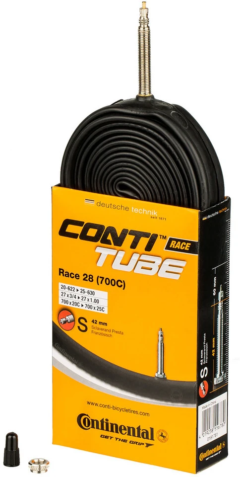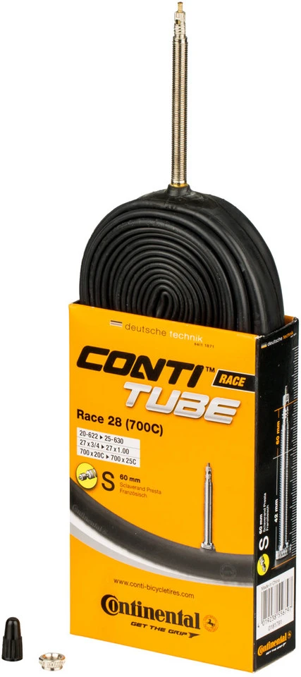 Désignation/synonymes : valve Sclaverand (SV), valve française, valve PrestaDiamètre extérieur : 6,5 mmAutres : la valve est dévissable sur toutes les chambres à air Continental avec valve SV (pour permettre l’utilisation d’un prolongateur de valve ou le remplissage avec un liquide anticrevaison, etc.).Contenu :1 x chambre à air Continental Race 28
