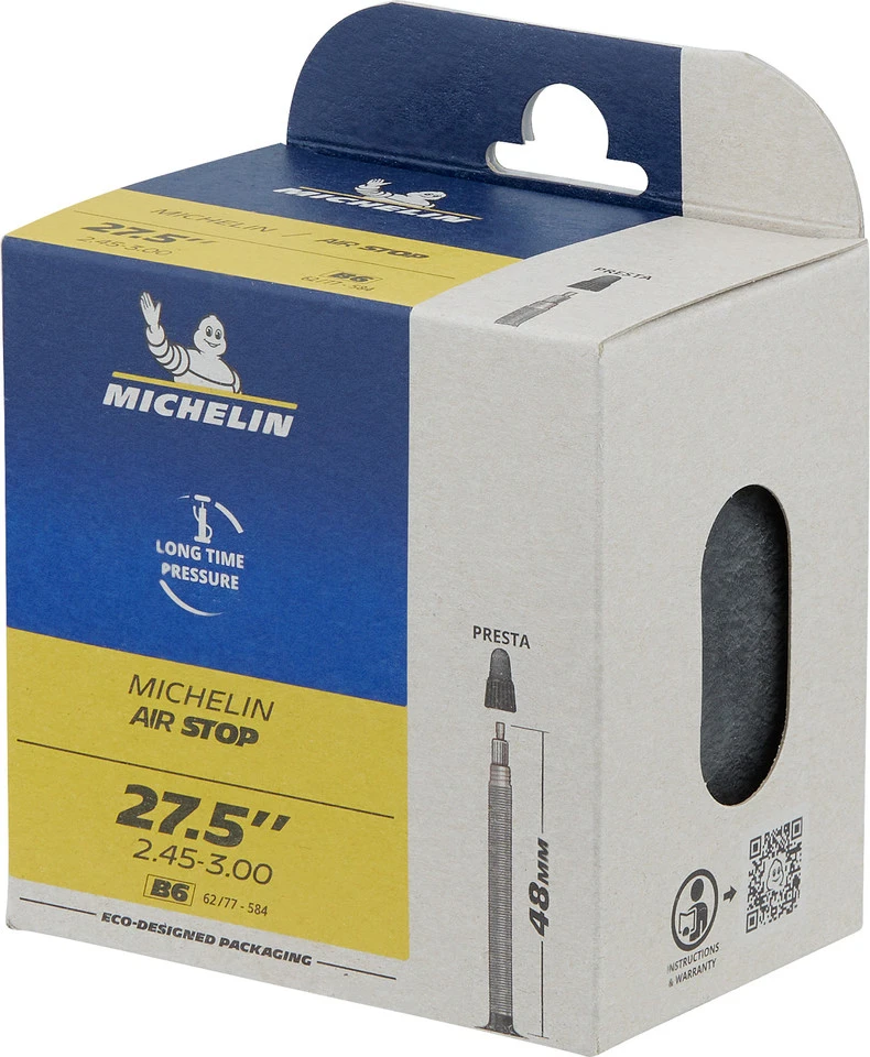 Type de valve:SV (Sclaverand/Presta)Longueur de valve:48 mmNuméro du fabricant:716374Contenu :1 x chambre à air Michelin B6 Airstop pour 27,5+