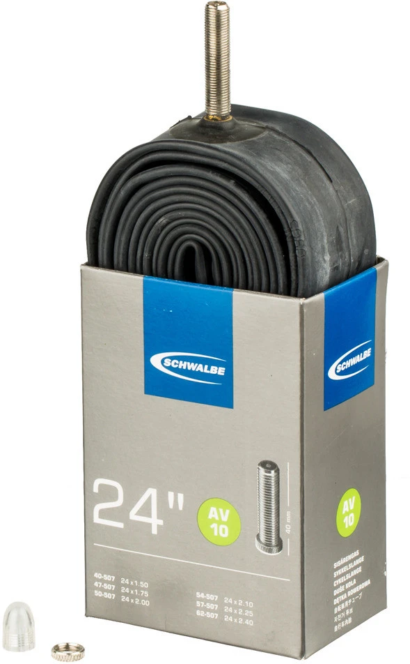 Spécifications :Utilisation :BMX, Trial, All MountainETRTO:40-507 à 62-507Dimensions du pneu:24 x 1,50 à 24 x 2,50Matériau de la chambre à air:butyleType de valve:AV 40 mm, DV 40 mm, SV 40 mmDimensions adaptées (ETRTO) :24 x 1,50 (40-507)24 x 1,75 (47-507)24 x 2,0 (50-507)24 x 2,10 (54-507)24 x 2,25 (57-507)24 x 2,50 (62-507)Versions :24×1,5-2,5 AV