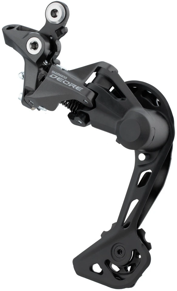 Le dérailleur arrière Deore RD-M4120 a été conçu par Shimano pour les transmissions à 2×10 et 2×11 vitesses pour le VTT et le trekking. Le plus grand pignon de cassette doit avoir 42 dents et la différence entre les plateaux ne peut pas dépasser 10 dents. Grâce à sa construction plate « Shadow » et à sa simple prétension, le dérailleur arrière ne heurte pas les bases, même sur les terrains accidentés.